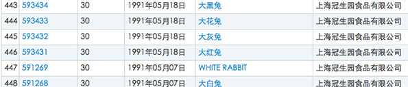大白兔”奶糖商標(biāo)所有者上海冠生園注冊的部分防御性商標(biāo)。本文圖片來源:國家工商行政管理總局商標(biāo)局網(wǎng)站