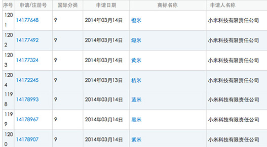 小米科技有限責(zé)任公司注冊了“大米”、“藍(lán)米”、“黑米”、“紫米”、“橙米”、“綠米”、“黃米”、“桔米”等商標(biāo)。