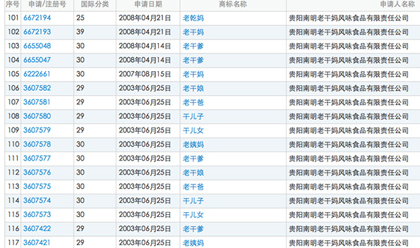 貴陽“老干媽”注冊的部分防御性商標(biāo)。