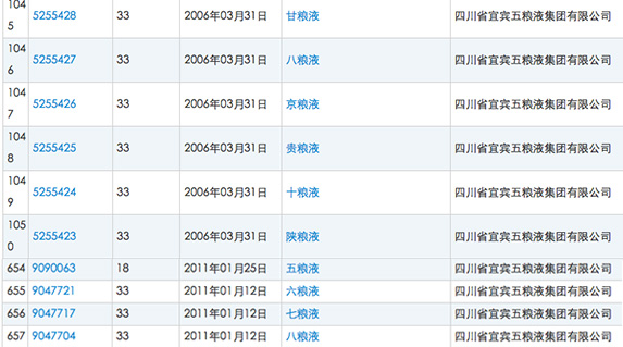 截至發(fā)稿,在國家工商總局商標(biāo)局的商標(biāo)綜合查詢系統(tǒng)里,可以查到四川省宜賓五糧液集團(tuán)有限公司共計持有2064個商標(biāo),除了眾人所知的“五糧液”,該公司還注冊了“六糧液”、“七糧液”、“八糧液”等。在商標(biāo)國際分類“33”類之下,該公司還注冊了“五糧液酒圣”、“五糧液安樂泉”、“五糧液奮進(jìn)塔”、“五糧液誠信碑”、“五糧液芝麻開花節(jié)節(jié)高”、“五糧液參天大樹”等商標(biāo)。此外,該公司還注冊了以各省簡稱為前綴的“五糧液”變種,比如“甘糧液”、“京糧液”、“貴糧液”、“陜糧液”等。